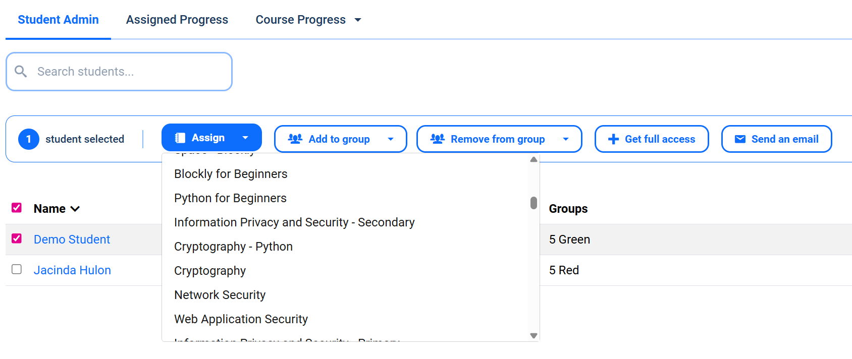 - From the 'Student Admin' or 'Assigned Progress' tabs select the students you would like to assign a course. You will be shown all students by default, but you can filter by grade or group (right side of screen).