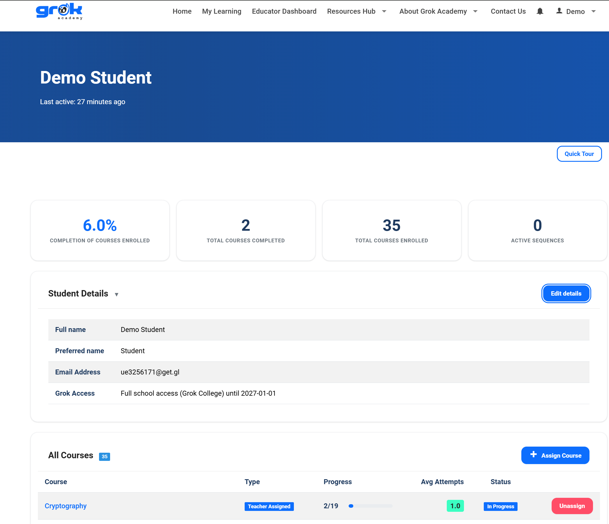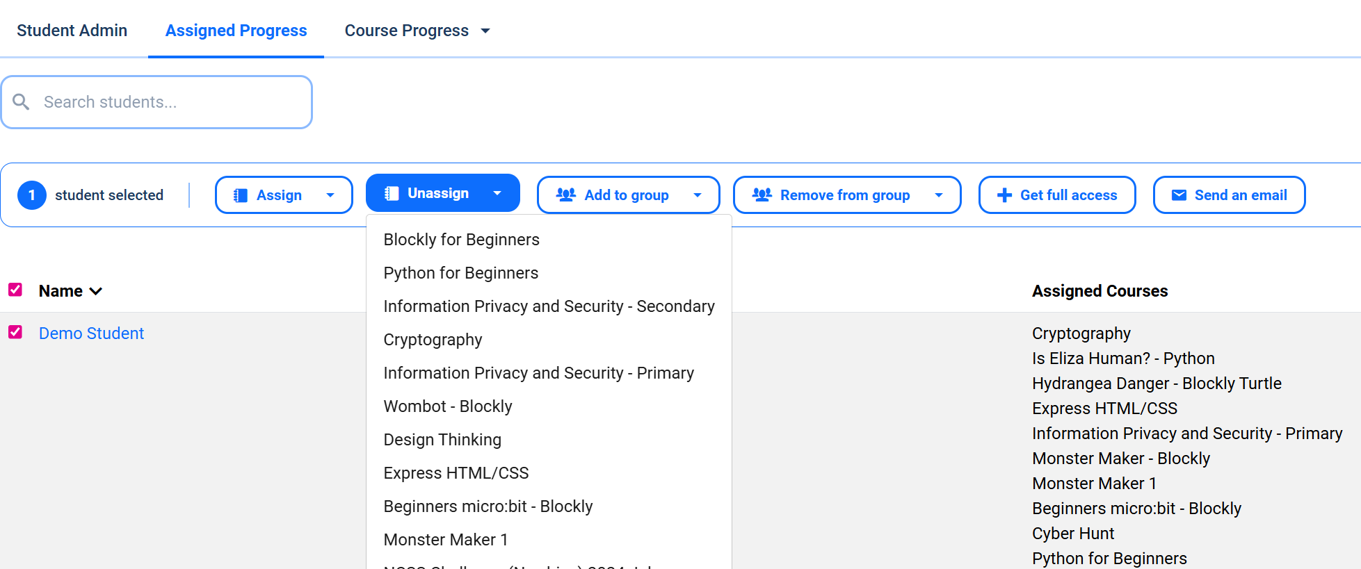 You can also assign and unassign content from the individual student by clicking on their name in the 'Manage Students' page.