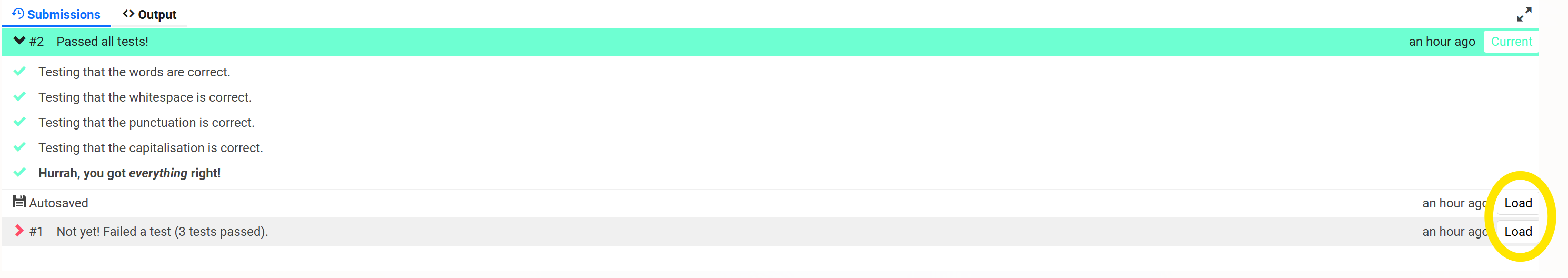 Then you can press the "Load" button next to different saves and submissions and the different versions will load into the workspace.