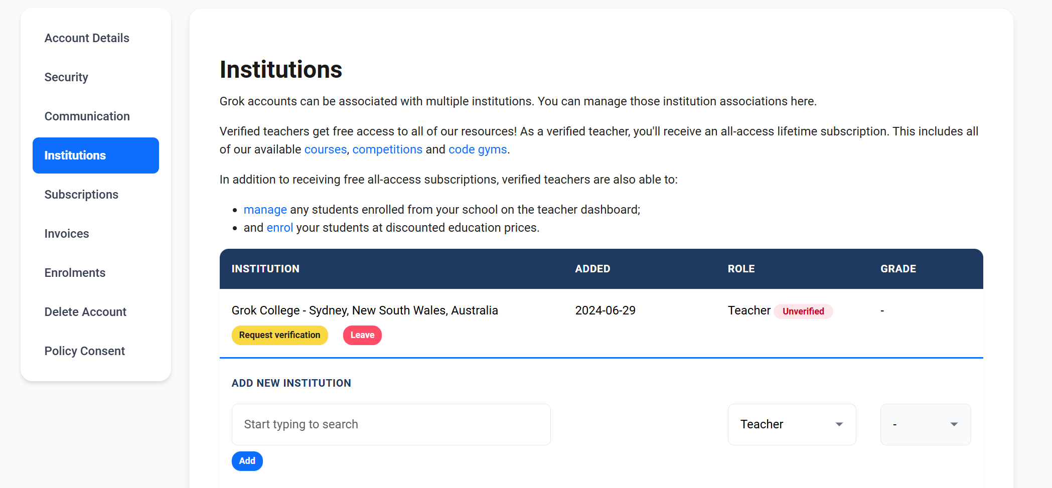 If your institution doesn't appear, and you are an Australian or Aotearoa New Zealand teacher please email us at help@grokacademy.org
